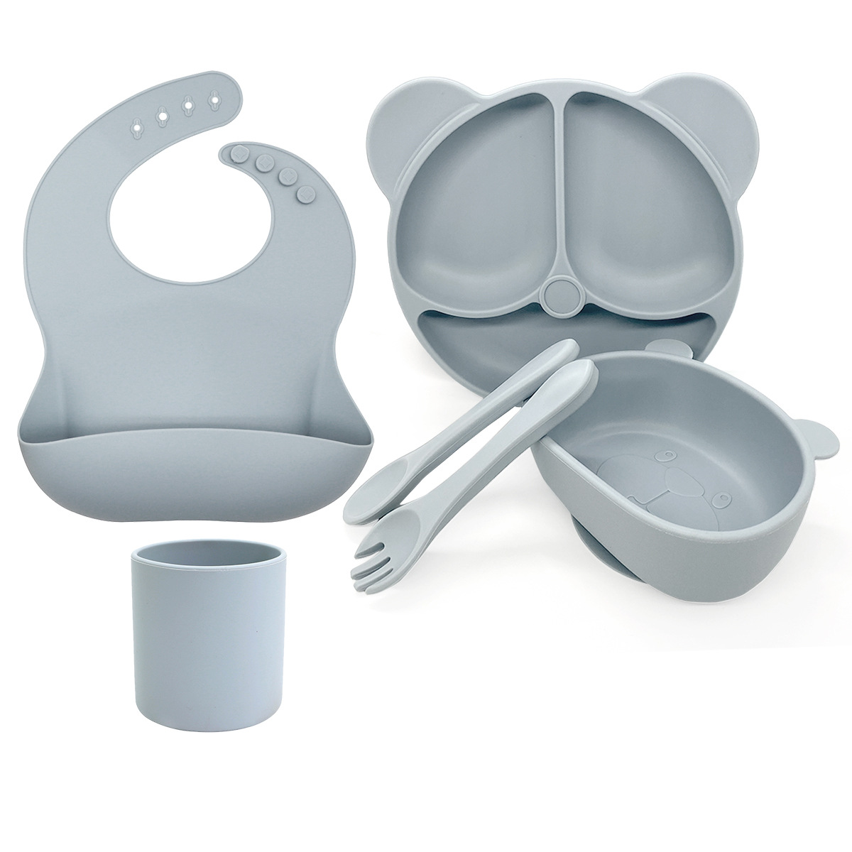 Grey 6-piece - Bear Plate + Bear Bowl + Tall Cup + Bib + Long Fork and Spoon