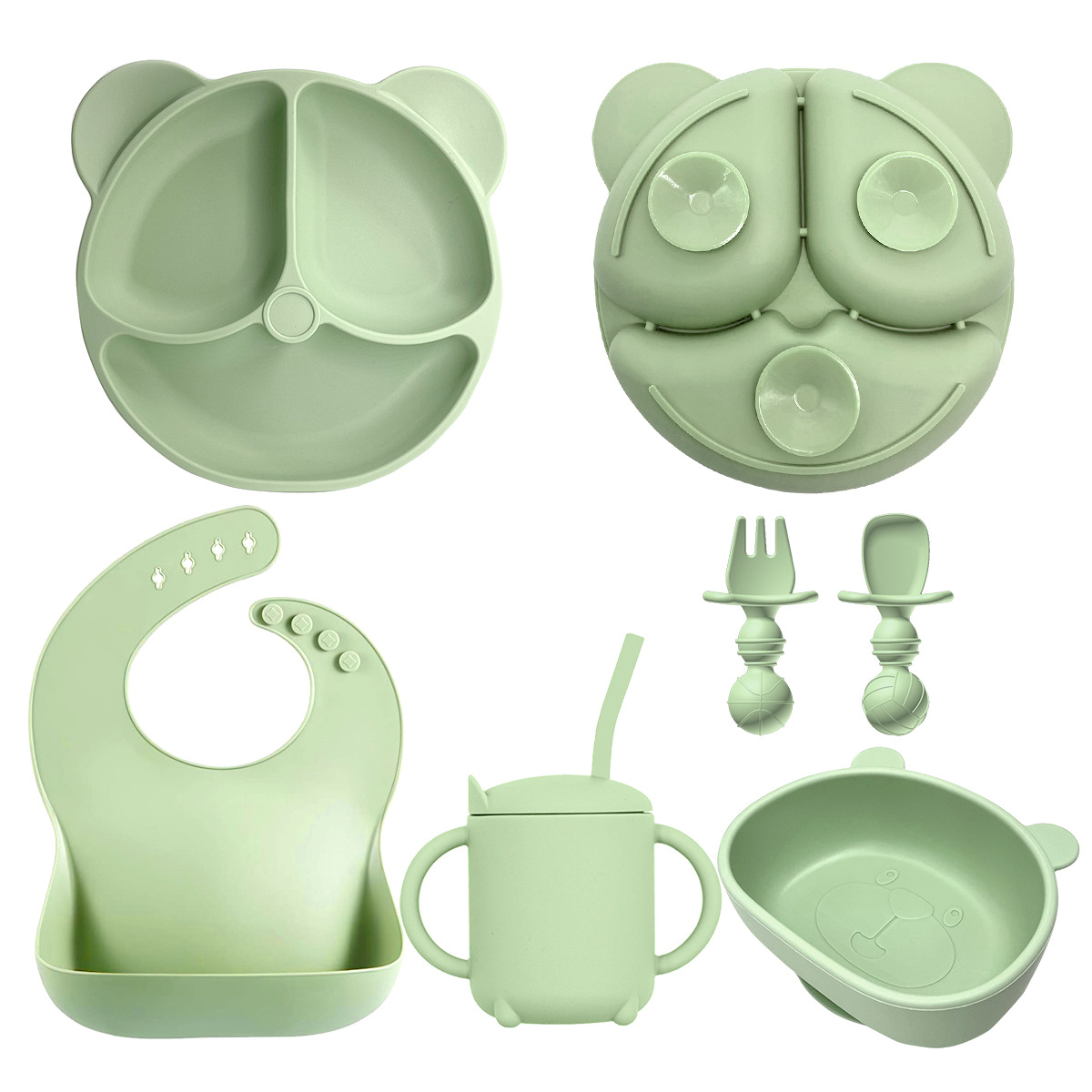 Dark Green 8-Piece Set - Bear Plate + Bear Head Bowl + Straw Cup + Bib + Long Fork & Spoon + Ball-Shaped Short Fork & Spoon
