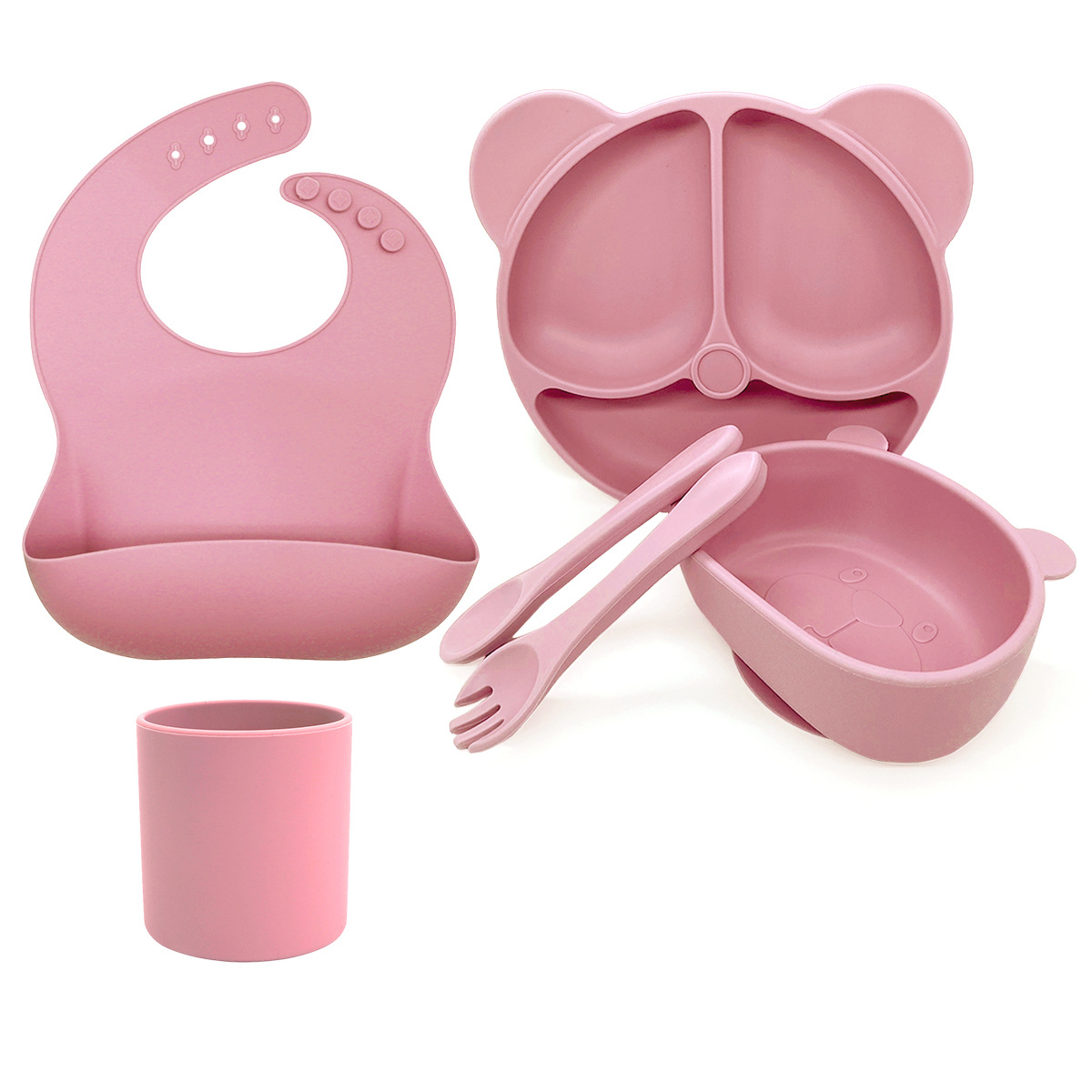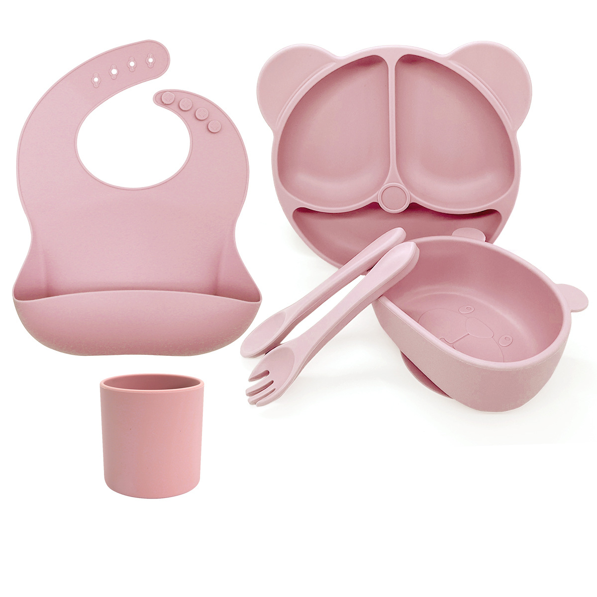 Light Pink 6-Piece Set - Bear Plates + Bear Bowls + Straight Cups + Bibs + Long Spoons