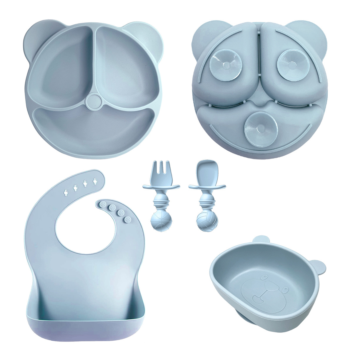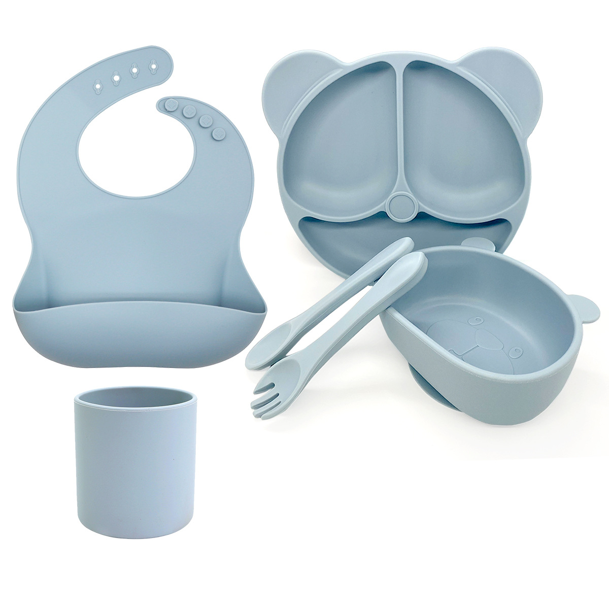 Gray Blue 6 Pieces - Bear Plate + Bear Bowl + Straight Cup + Bib + Long Fork and Spoon