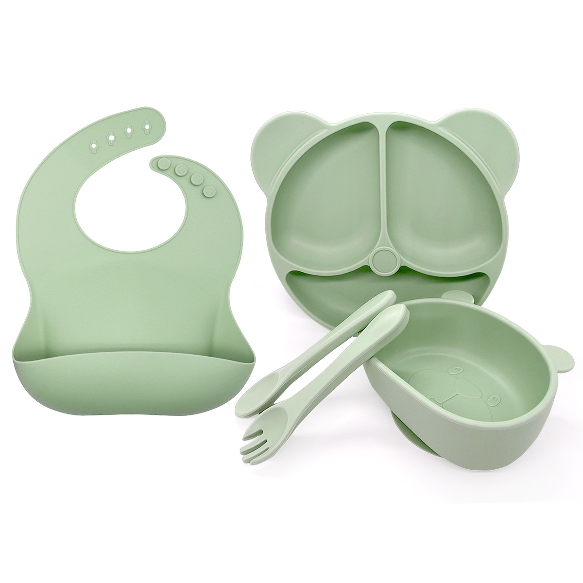 Emerald Green 5-Piece Set - Bear Plate + Bear Bowl + Bib + Short Fork + Short Spoon