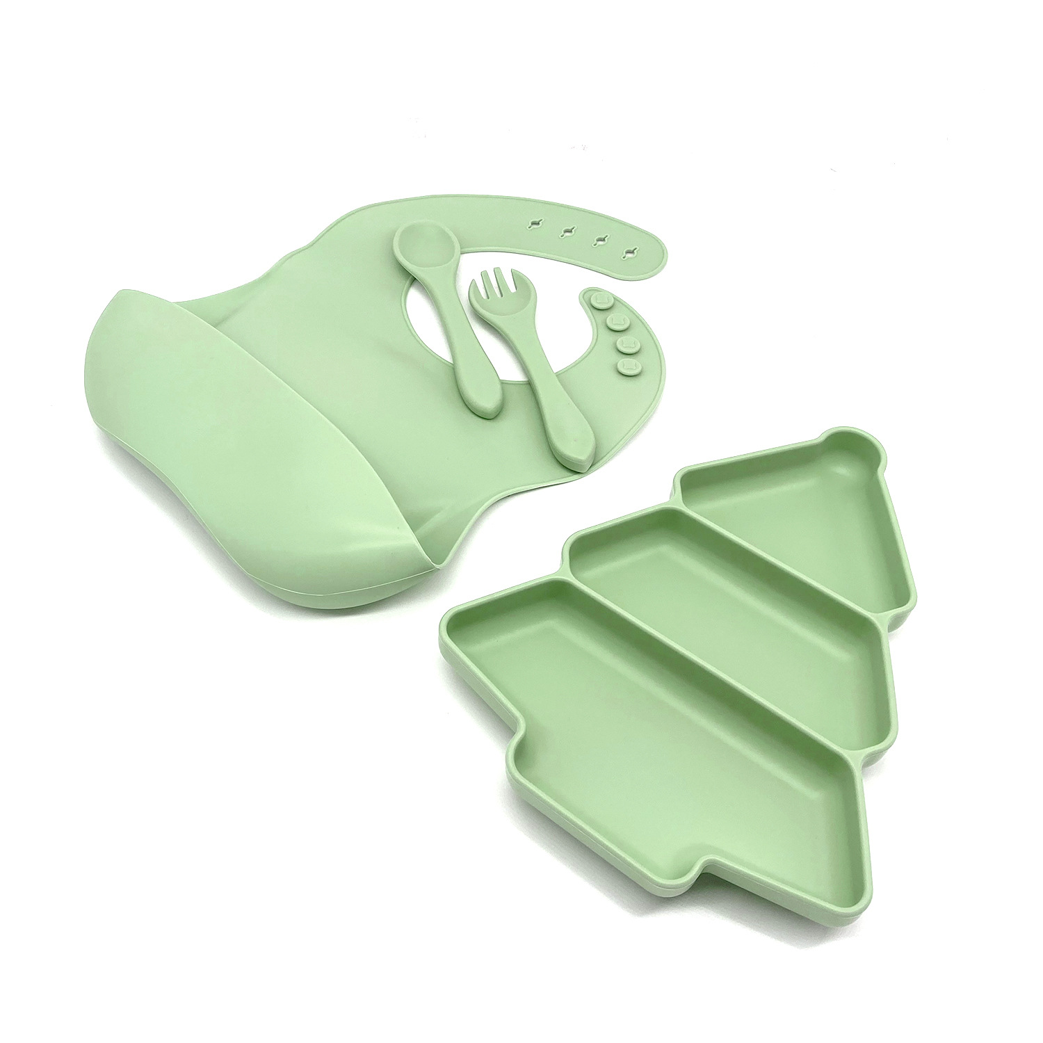 Moss Green 7 Pieces - Teddy Bear Plate + Dual-Ear Bowl + Bib + Tall Cup + Short Fork and Spoon + Long Silicone Spoon