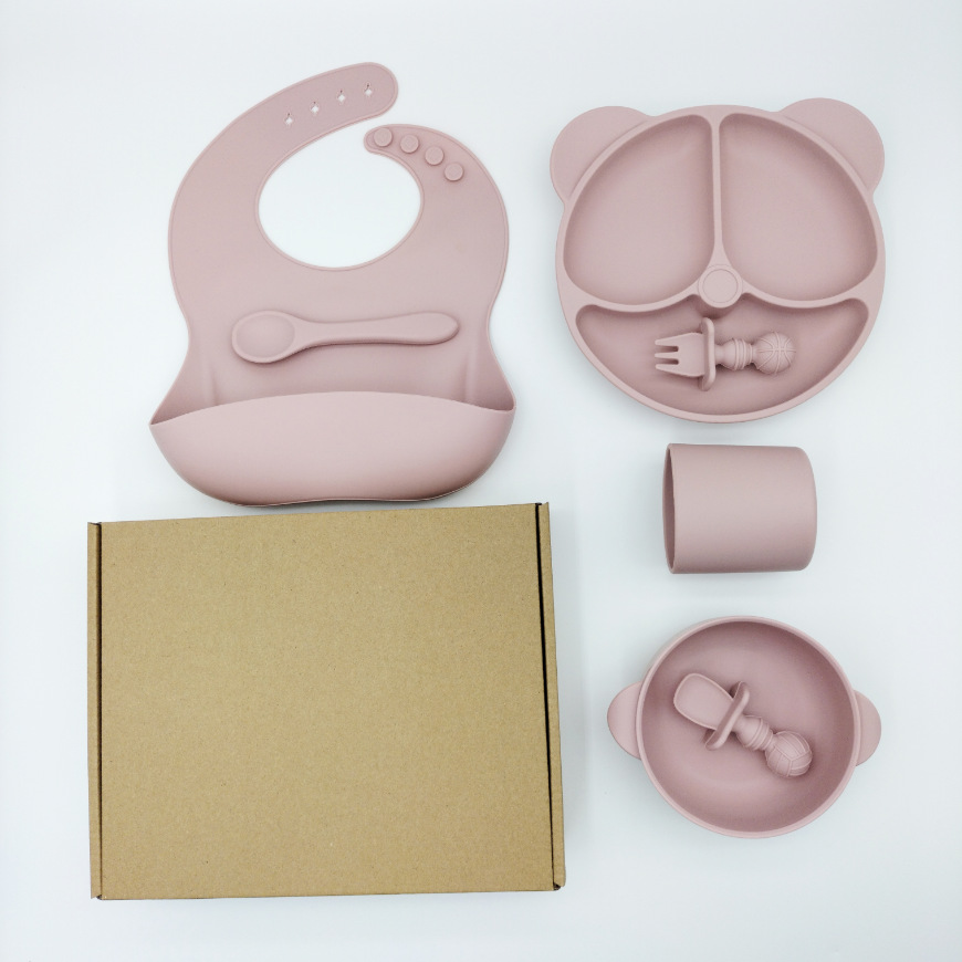 Light Pink 7-Piece Set - Bear Plates + Dual-Ear Bowls + Bibs + Straight Cups + Short Forks & Spoons + Long Silicone Spoons