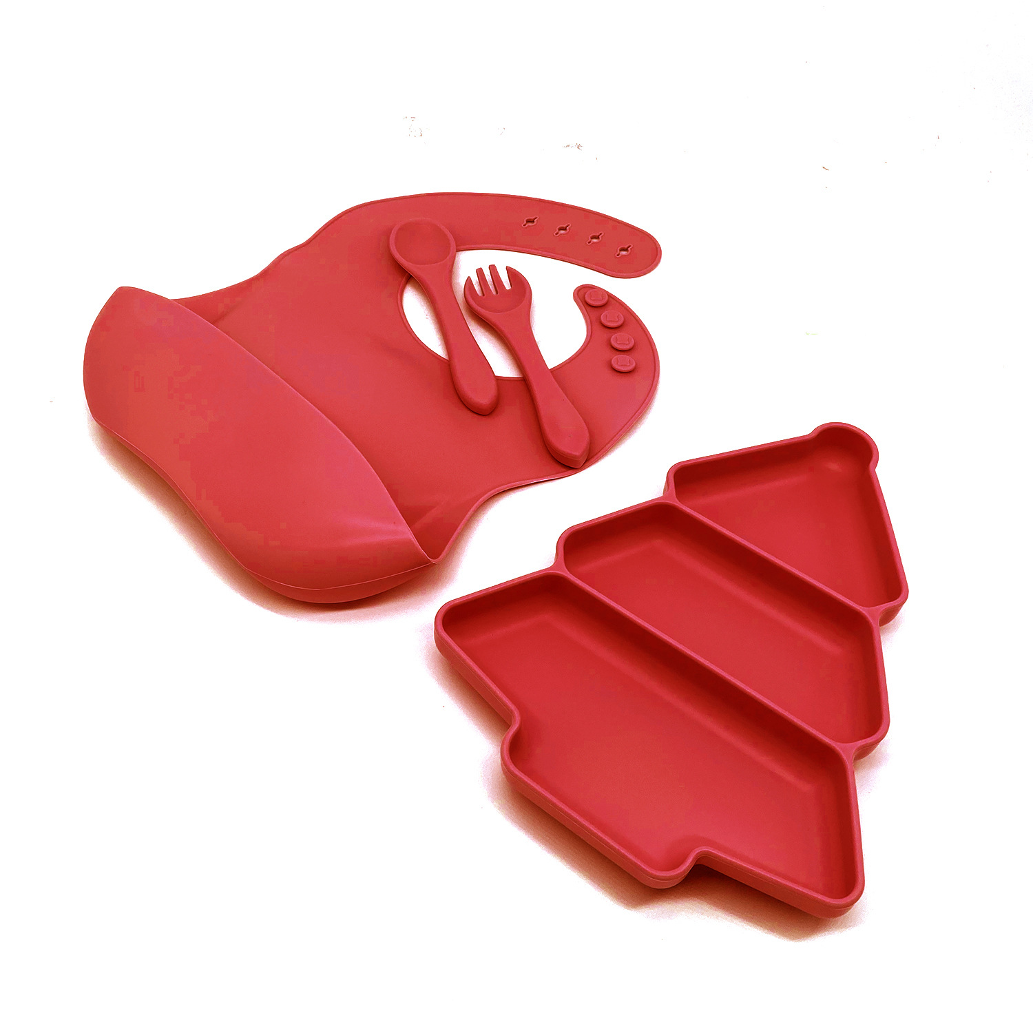 Red 4-piece - Christmas Dinner Plate + Bib + Long Fork and Spoon