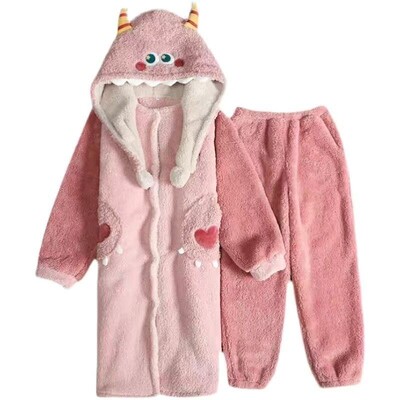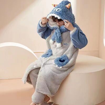 Little monster coral velvet thickened hooded nightgown for women winter cute cartoon long flannel bathrobe pajamas