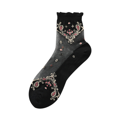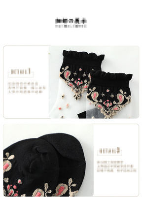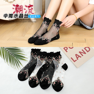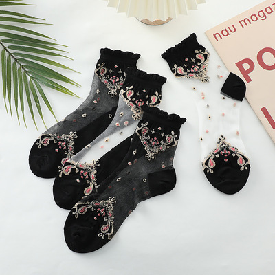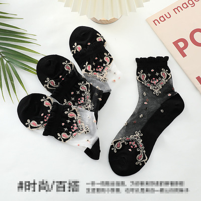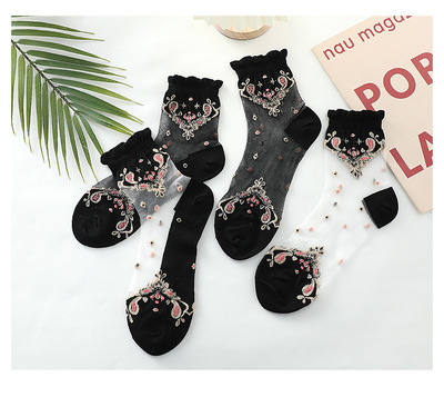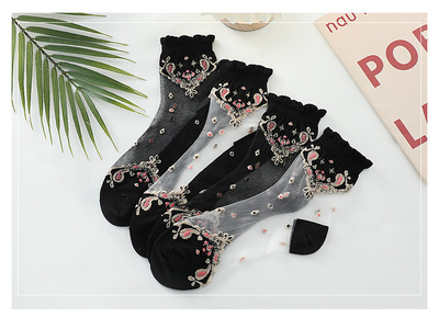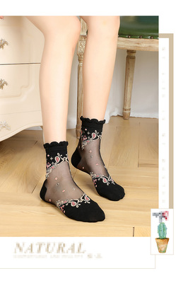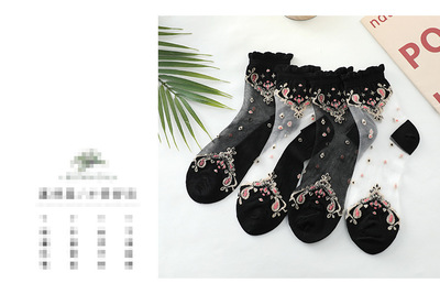 Stockings for women, crystal silk glass, thin cotton bottom, anti-snatch, transparent embroidered ice silk, black mid-calf lace women's stockings
