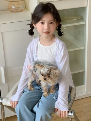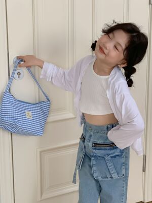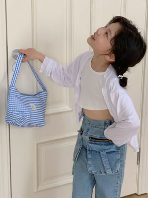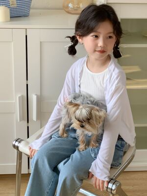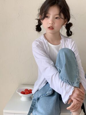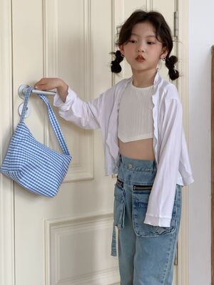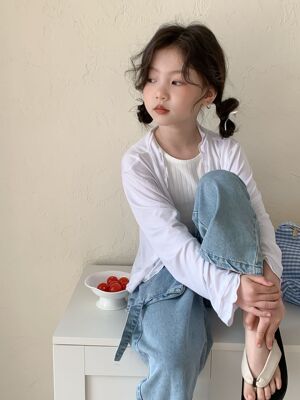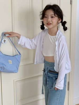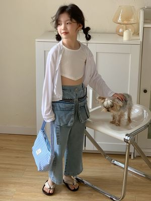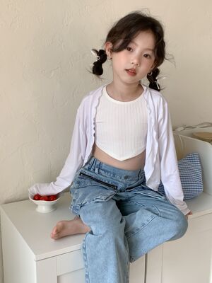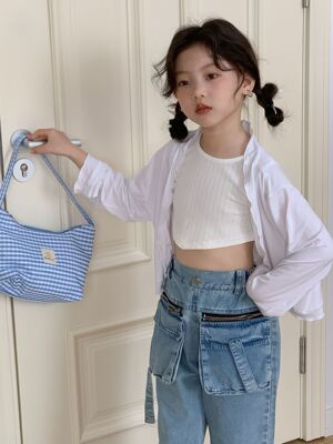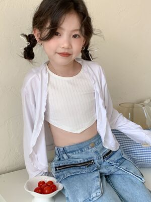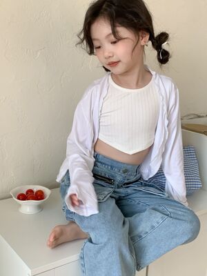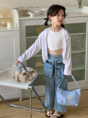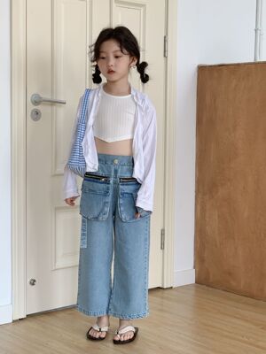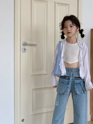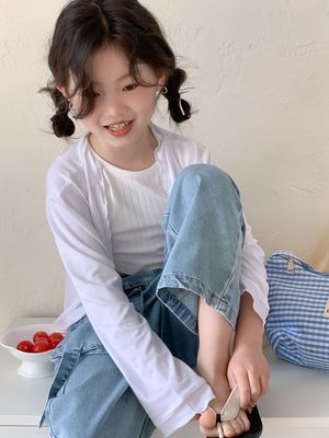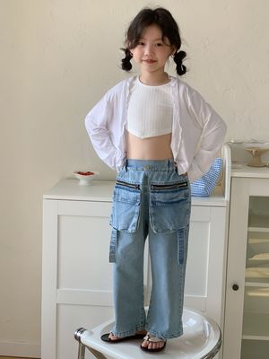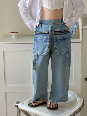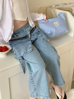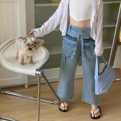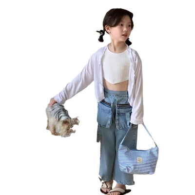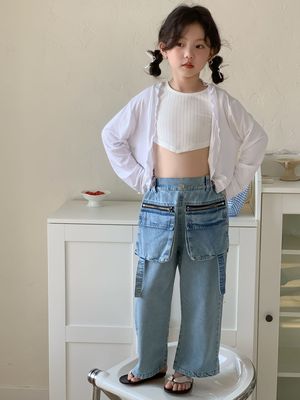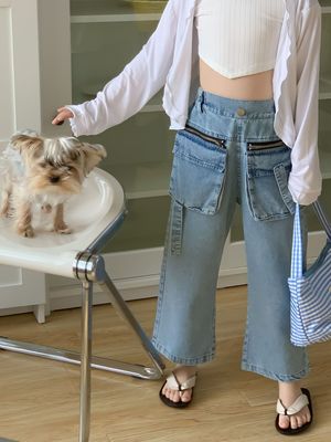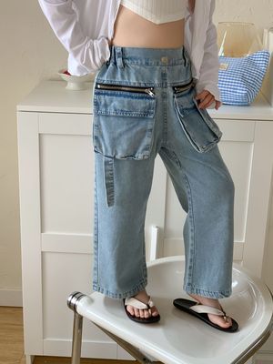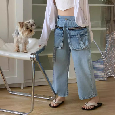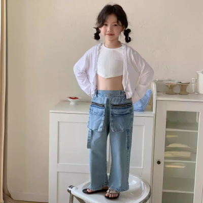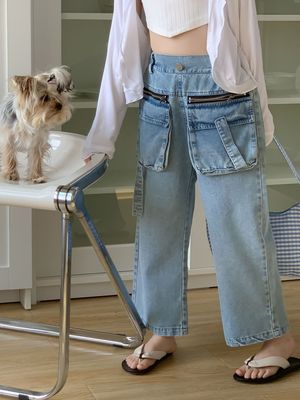 童褲2024夏款女童設計款牛仔褲中大童立體袋褲子女寶闊腿褲長褲