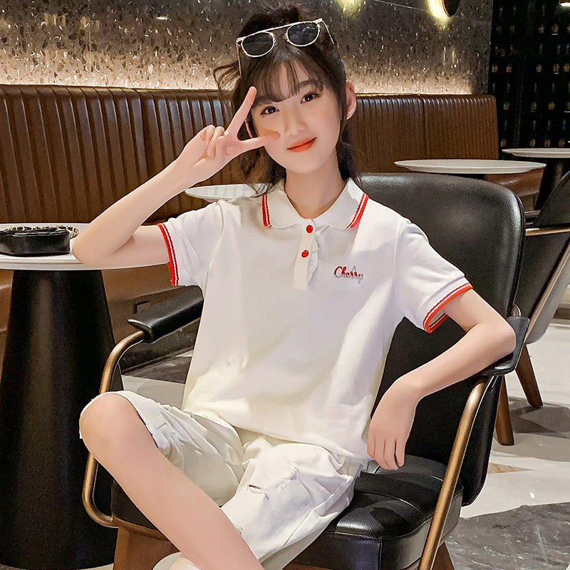 Girls summer short-sleeved POLO shirt top lapel baseball uniform tennis uniform cotton medium and large children's striped shirt sports trend