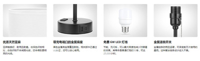 (1 piece) A+C, 2-prong, zipper switch, flat three-color bulb, straight筒 white cotton linen shade