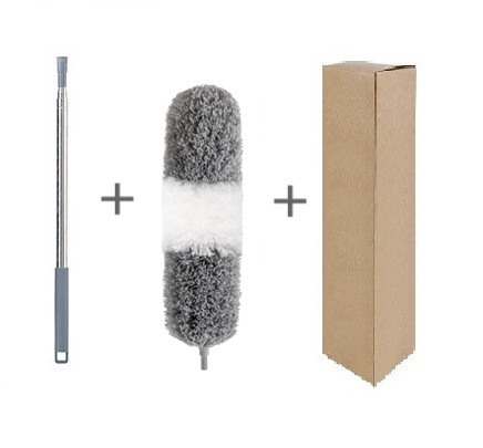 Pole + microfiber head (grey) + chenille head + crevice brush head + ceiling sweeper in carton