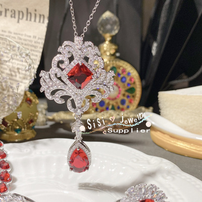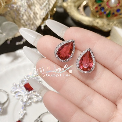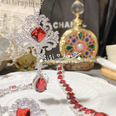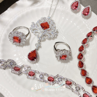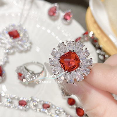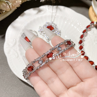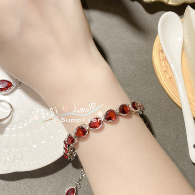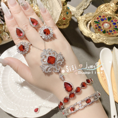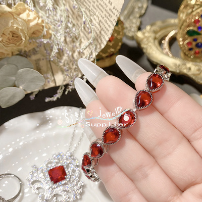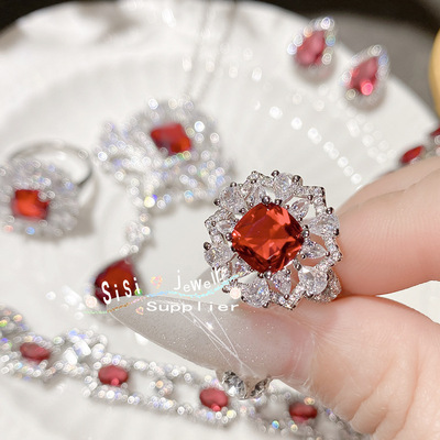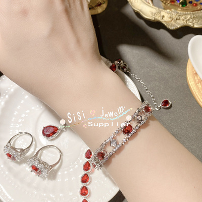 SIsi貴氣精緻石榴紅寶石戒指 古董感鍍18K金水沫玉鴿子蛋鋯石手鍊