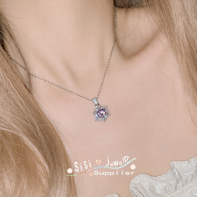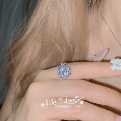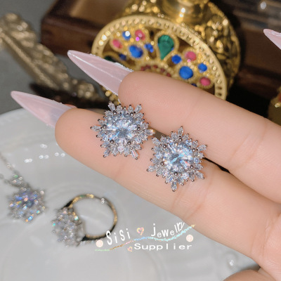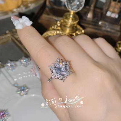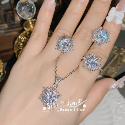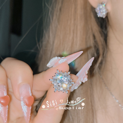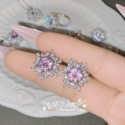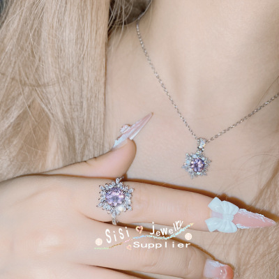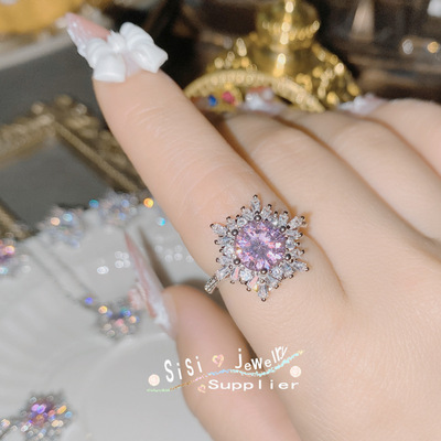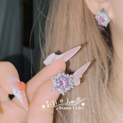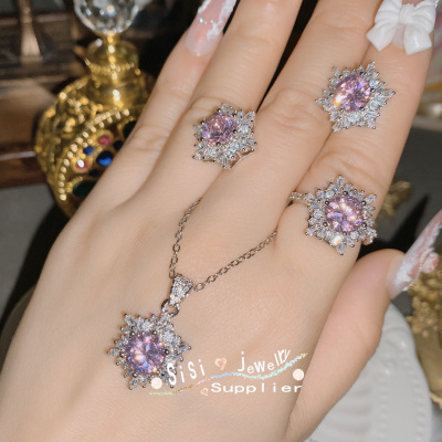 SIsi Brilliant Princess Pink Gemstone Ring for Women 18K Plated Hollow Seiko Snowflake Earrings Inlaid with Zirconium Live Set