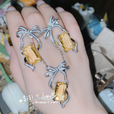 SIsi銀針鋯石小眾蝴蝶結方形耳環 鍍18k 韓系少女粉設計個性項墜