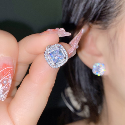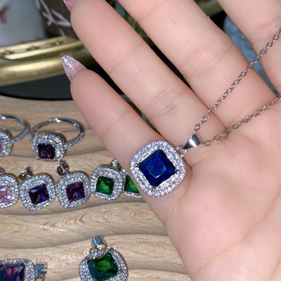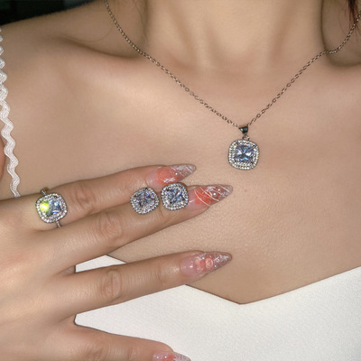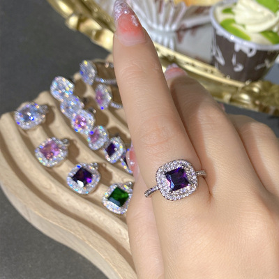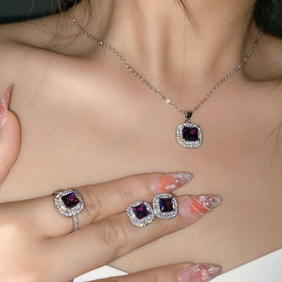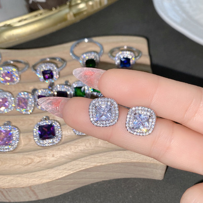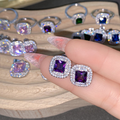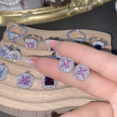 Sisi葡萄紫耳釘 公主粉彩寶鑲鋯石阿斯切方鑽活口戒指三件套直播