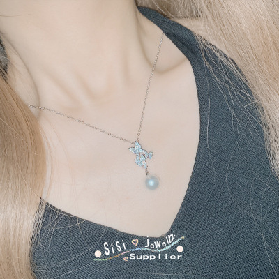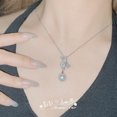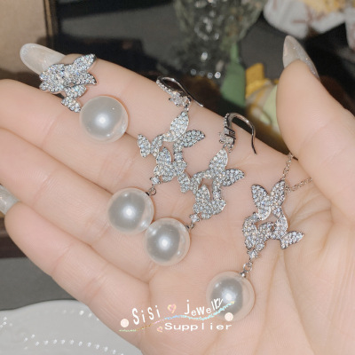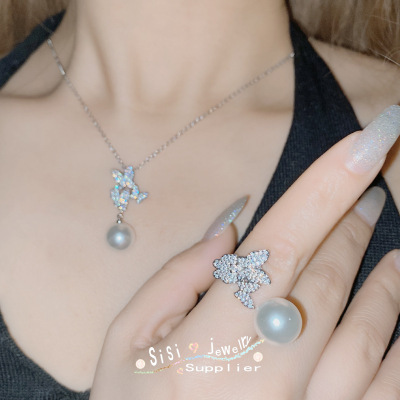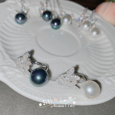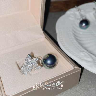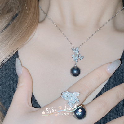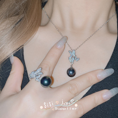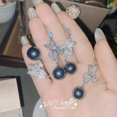 SIsi銅底鍍金復古新款鑲大地溪14mm黑珠貝珠時尚蝴蝶手工鑲鑽套裝