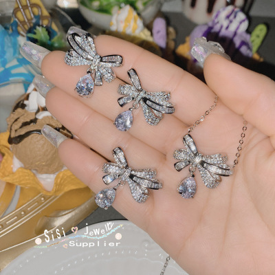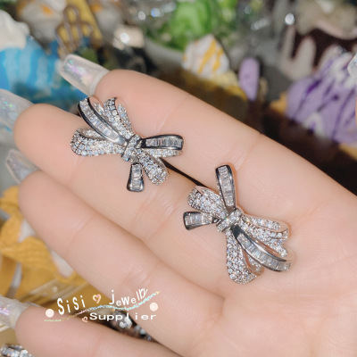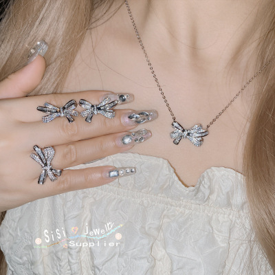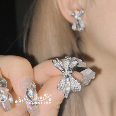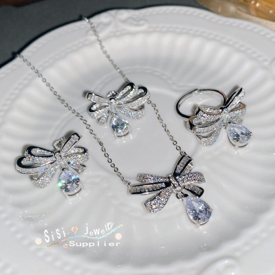 Sisi氣質高級感蝴蝶結簡約戒指 鍍18K 微鑲滿鑽方鋯蝴蝶耳環項鍊