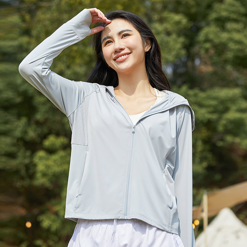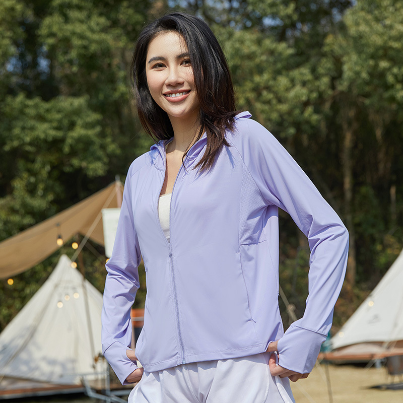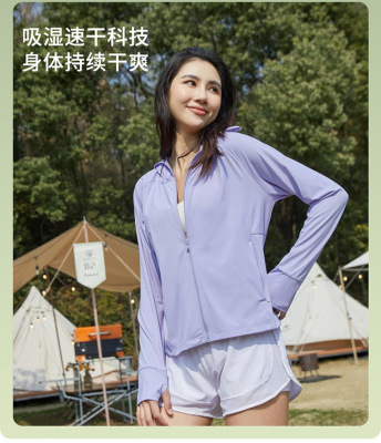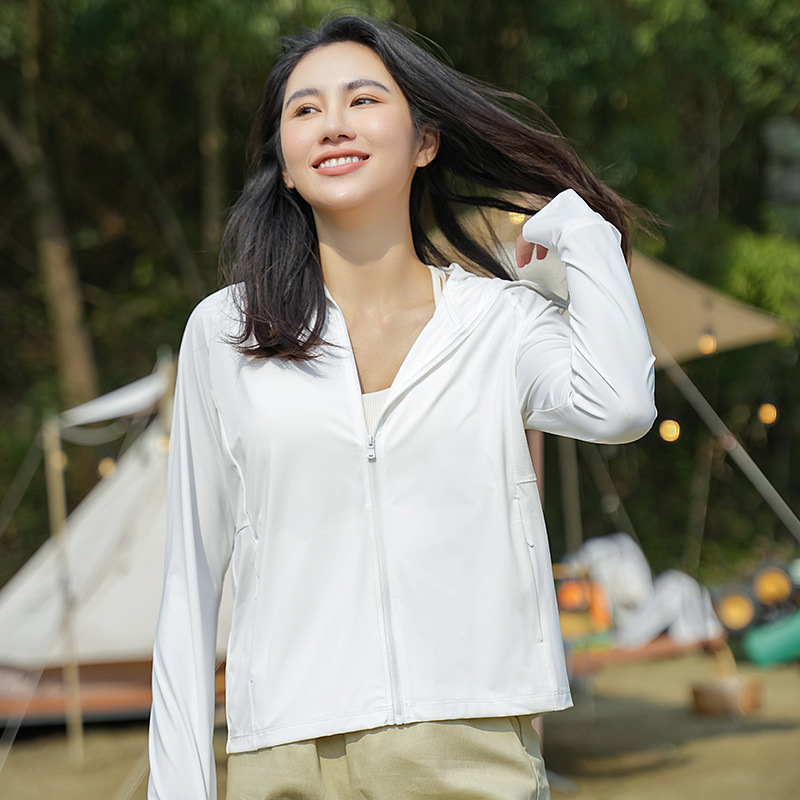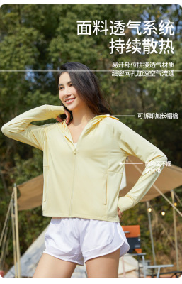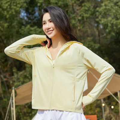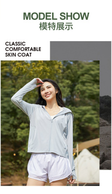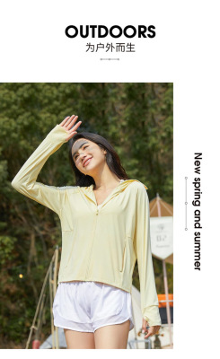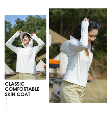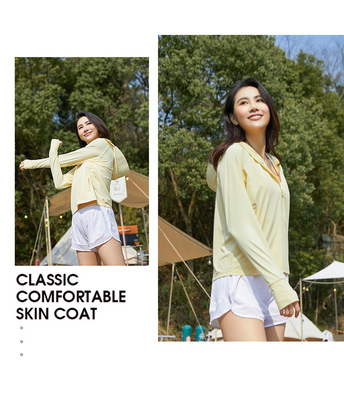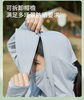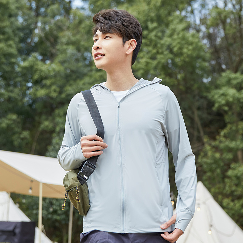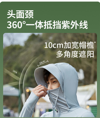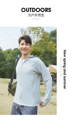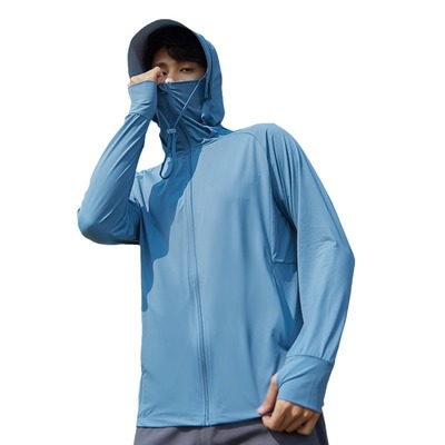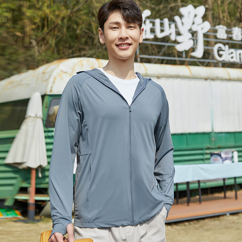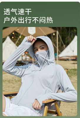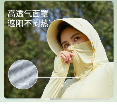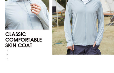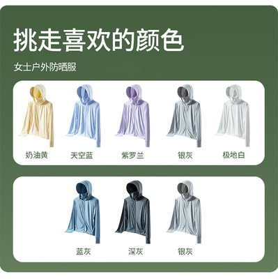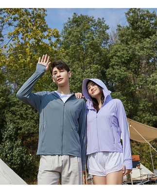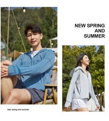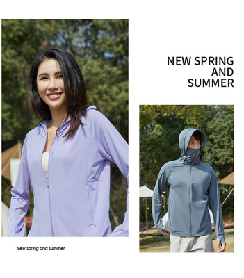 A pair of summer ice silk UV-protective skin clothes for couples, featuring hooded sun protection jackets for men and women, similar to a certain banana style.