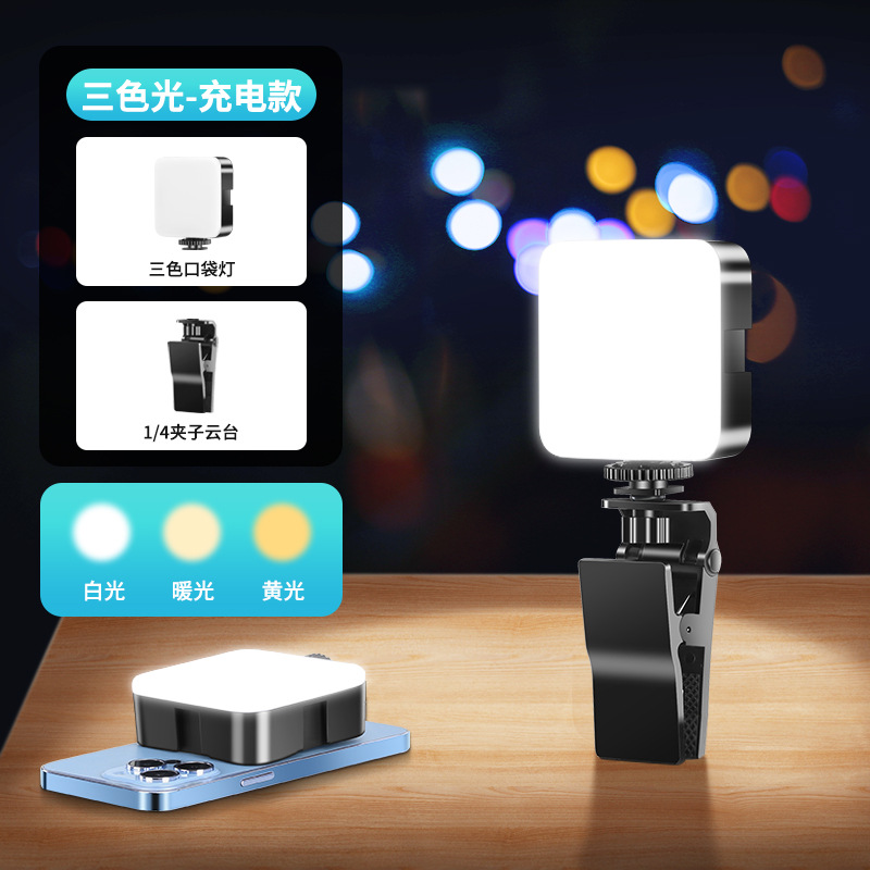 Three-color LED light + hot shoe one-piece clamp + desktop stand