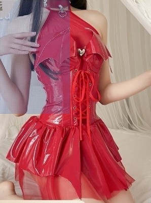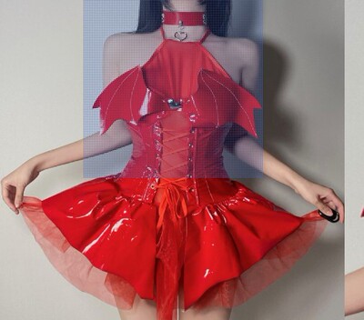 Charming Little Demon Sexy Shiny PU Necktie Belt Sheer Short Skirt Set Demon Cosplay Costume Women's