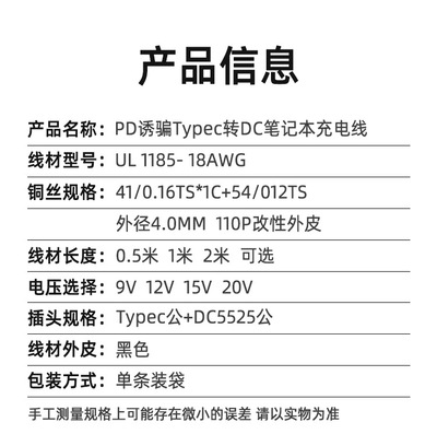 Specification Model: 15V Convoy Type-C Male to DC5525 Red Fork 0.5m