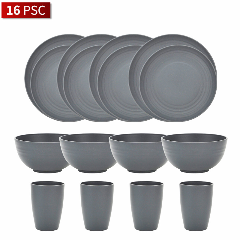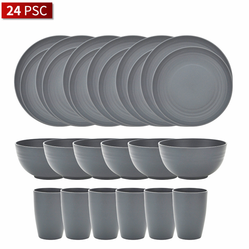 跨境亞馬遜熱銷小麥秸稈深灰色餐盤水杯飯碗套裝野餐禮品戶外套裝