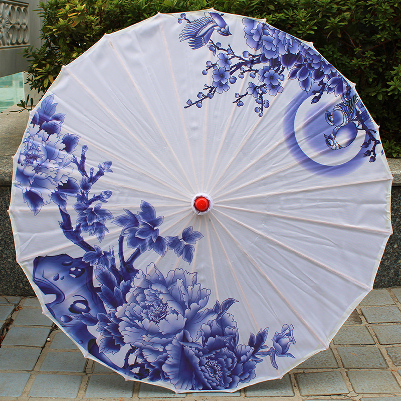 Blue and White Porcelain Decorated Ceiling Ancient Style Processional Umbrella Prop Wedding Decoration Fashion Show Chinese Style Printed Oil Paper Umbrella Wholesale