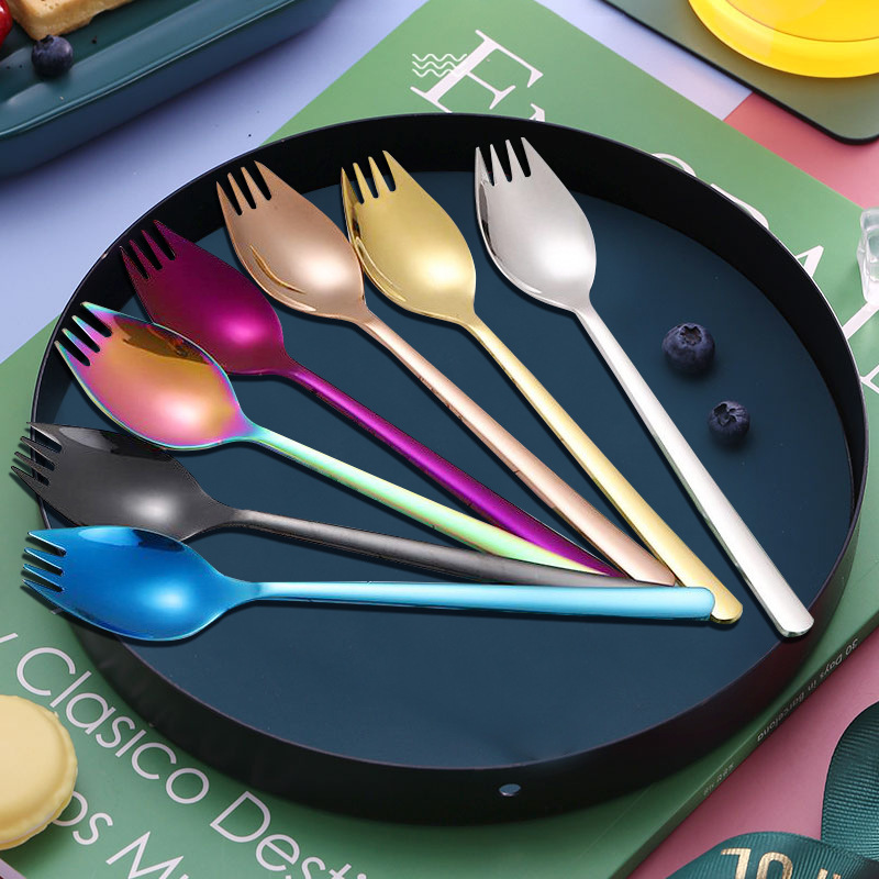 304不鏽鋼沙拉勺叉 長柄叉勺一體水果叉湯勺調羹勺子創意餐具吃麵