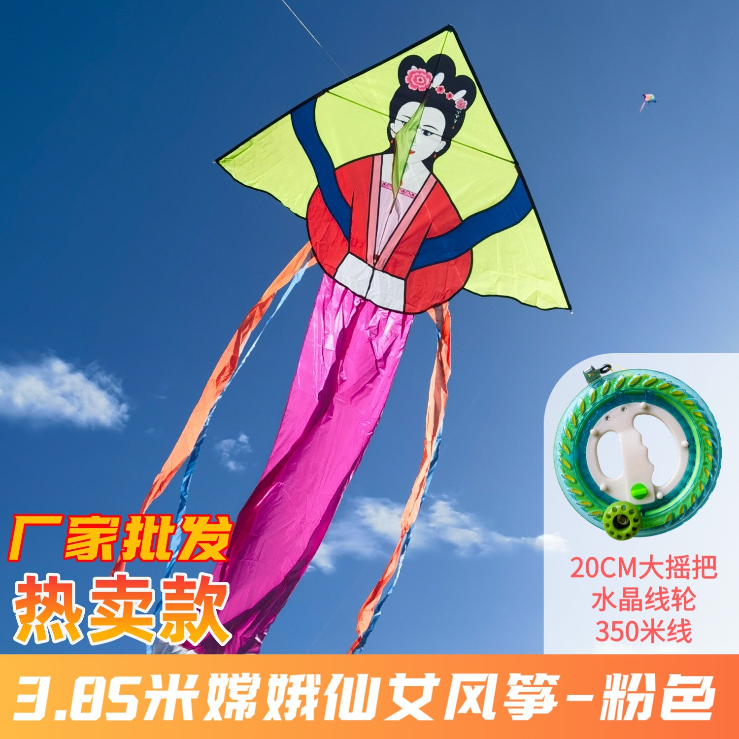 Moon Goddess Fairy Kite 1.6x3.85 meters - Pink + 20CM Large Wobble Handle Line Wheel + 350-meter Line