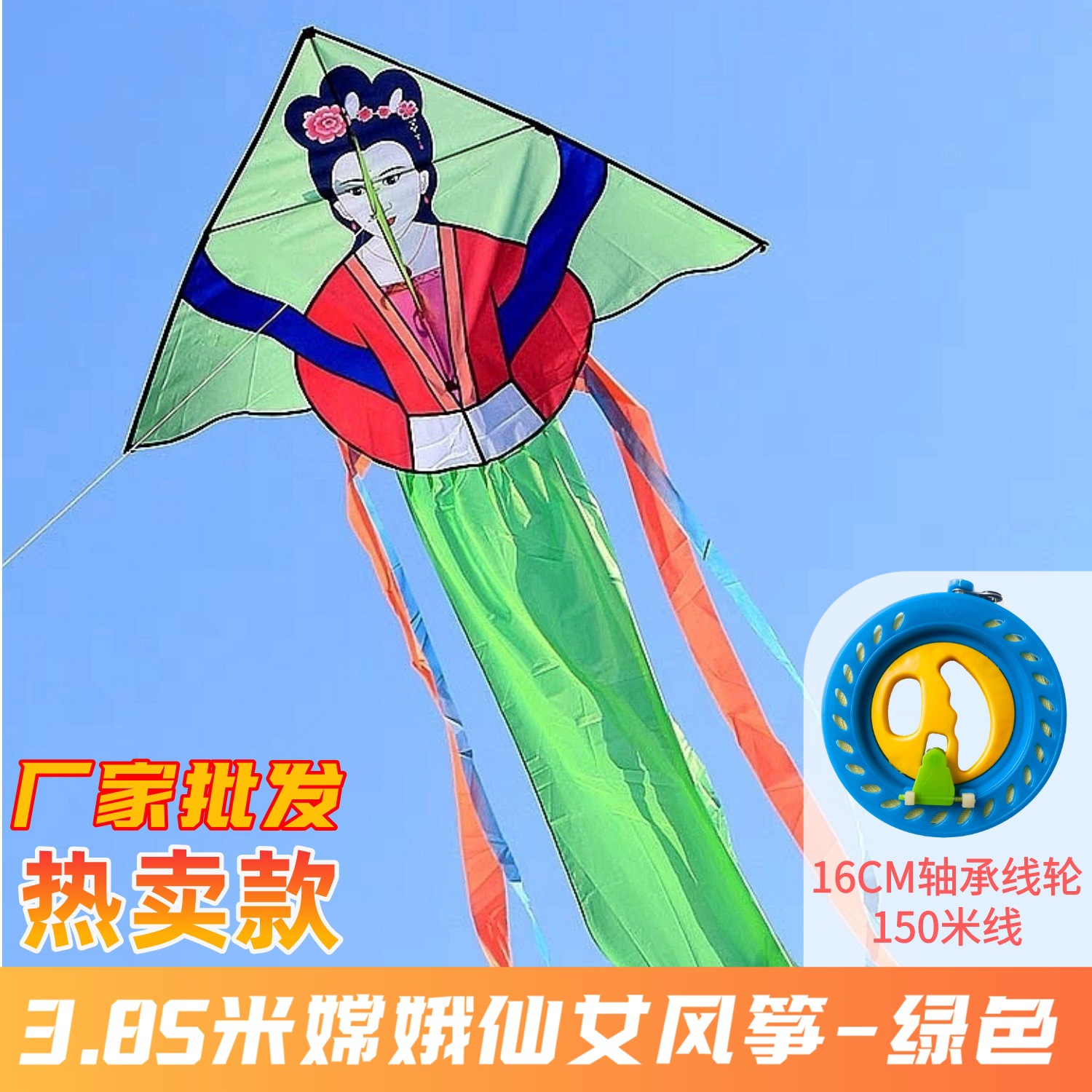 Moon Goddess Fairy Kite 1.6x3.85 meters - Green + 16CM Line Wheel + 150-meter Line