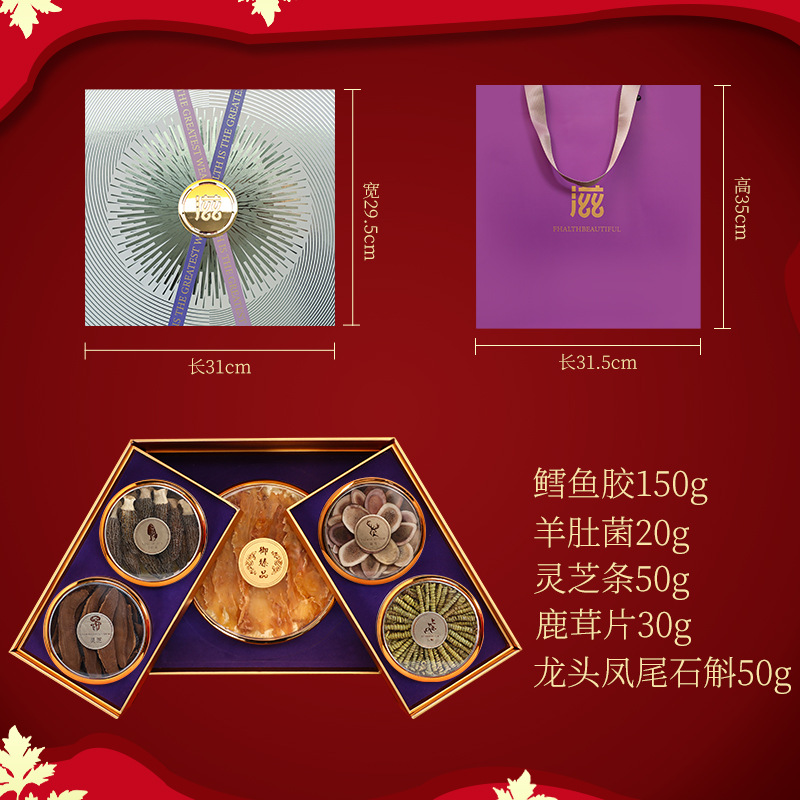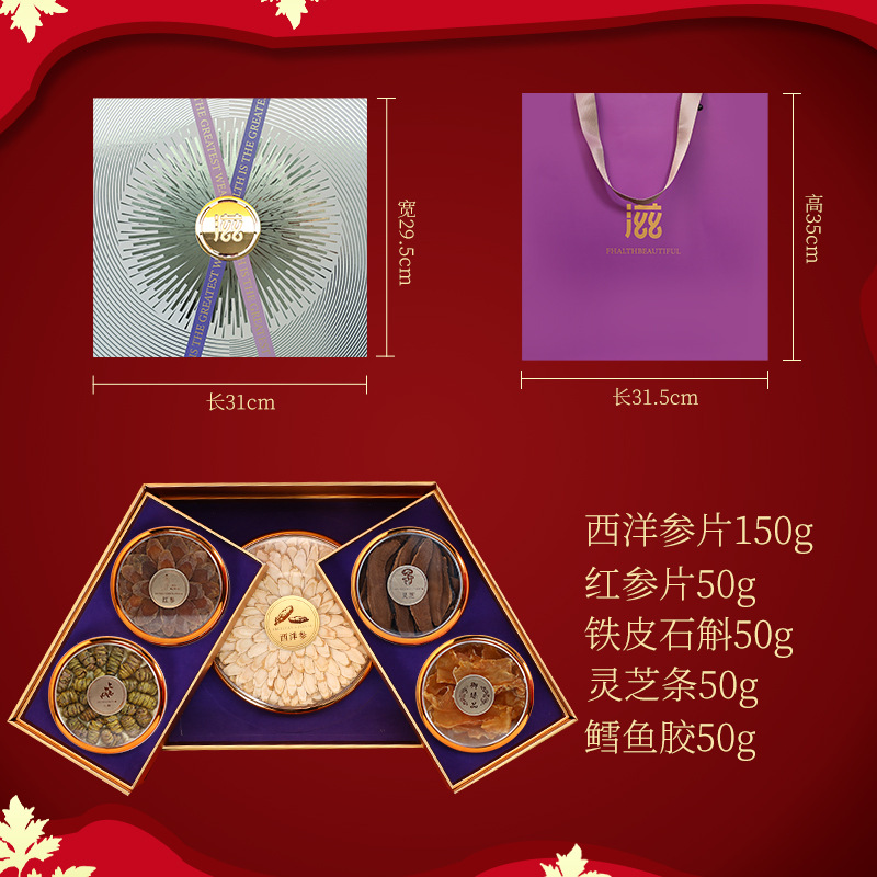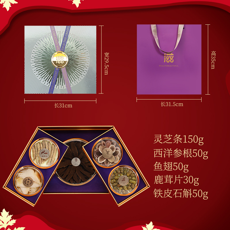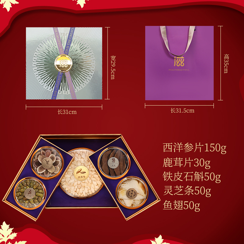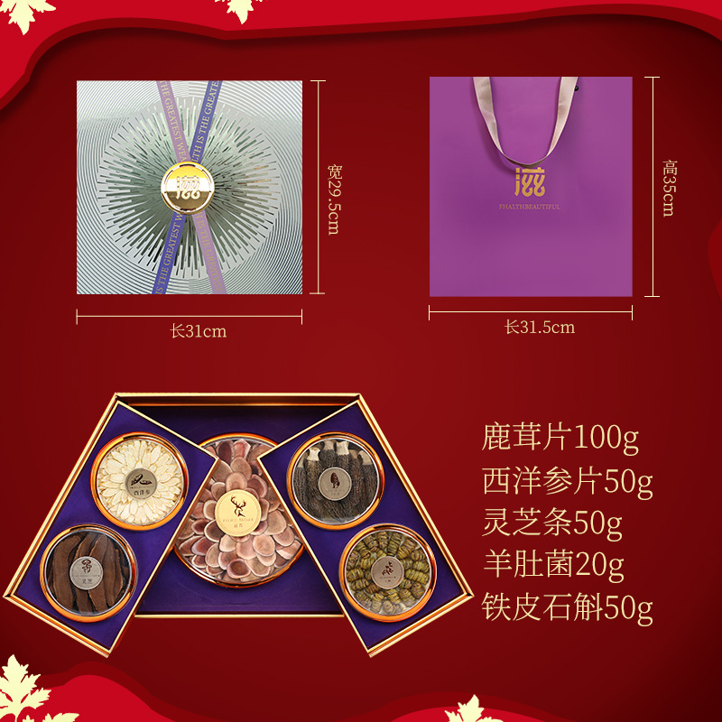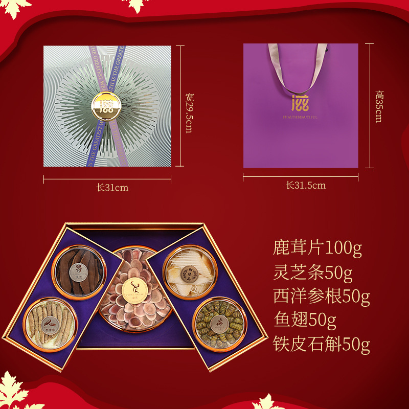 包裝規格:鹿茸片-靈芝條-西洋參根-魚翅-鐵皮石斛