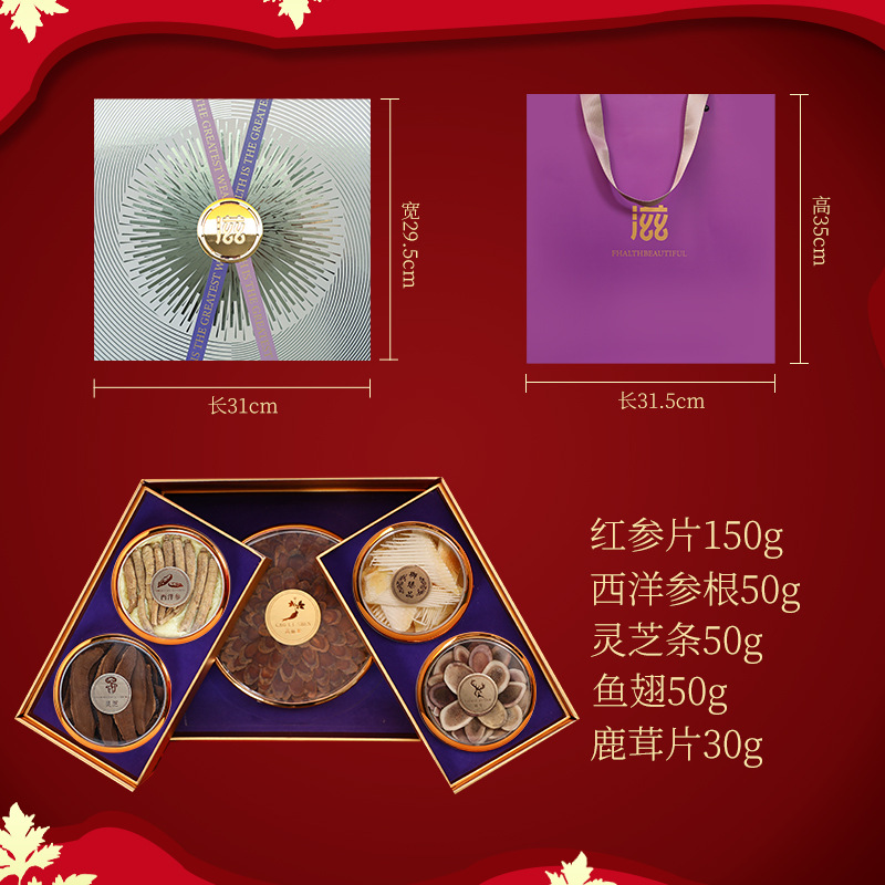 包裝規格:紅參片-西洋參根-靈芝-魚翅-鹿茸片