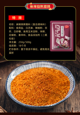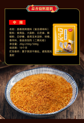 Raw materials and ingredients: edible salt, garlic powder, white sesame seeds, chili powder, white sugar, edible corn starch, monosodium glutamate, spices.