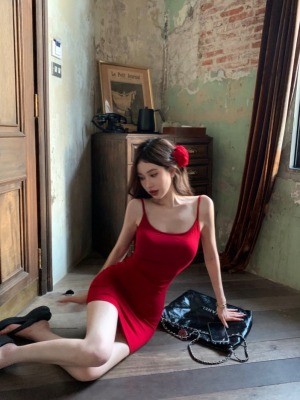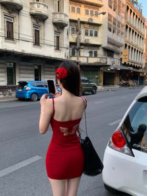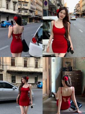 Real shot of a slim-fitting embroidered butterfly embroidered suspender dress with built-in breast pads