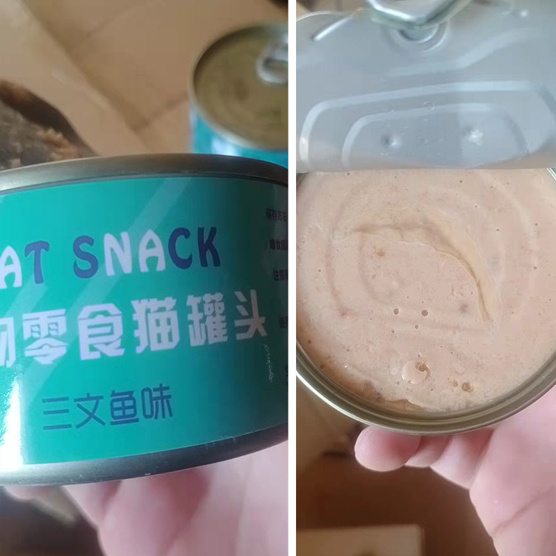 Processing canned food with 80g gold cans, chicken, fish, and black and white labels