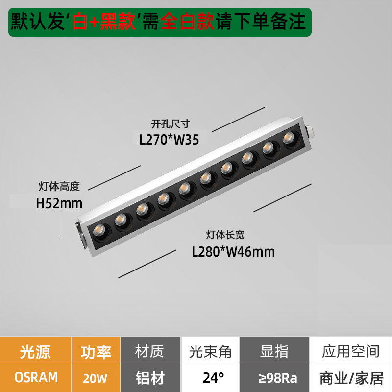 Minimalist long strip spotlight, recessed grille light for living room—LED ceiling lamp with multiple heads and a rectangular design.