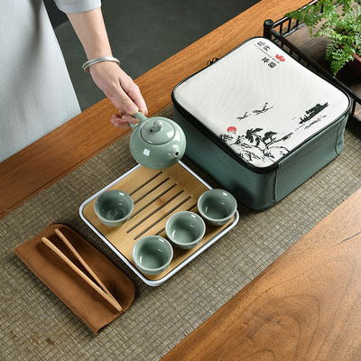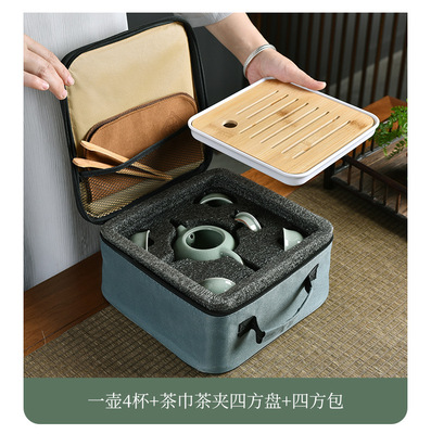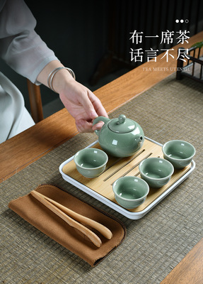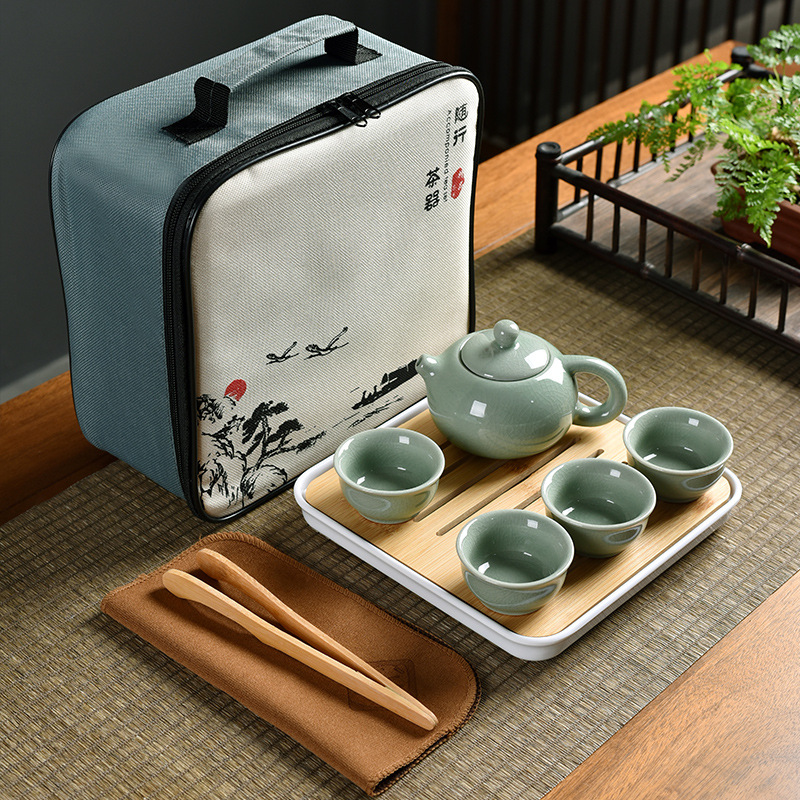 A Meiziqing celadon ware pot with four cups + tea cloth + tea tongs + square plate + travel bag