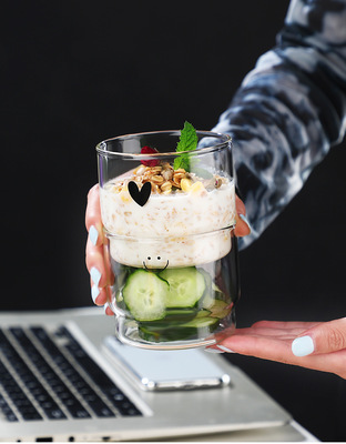 Handmade heat-resistant glass coffee milk cup, stackable smiling face love glass cup, drink pudding bowl, cute small bowl