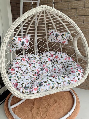 Two-person white twisted edge basket with double handles, with seat cushion and rug