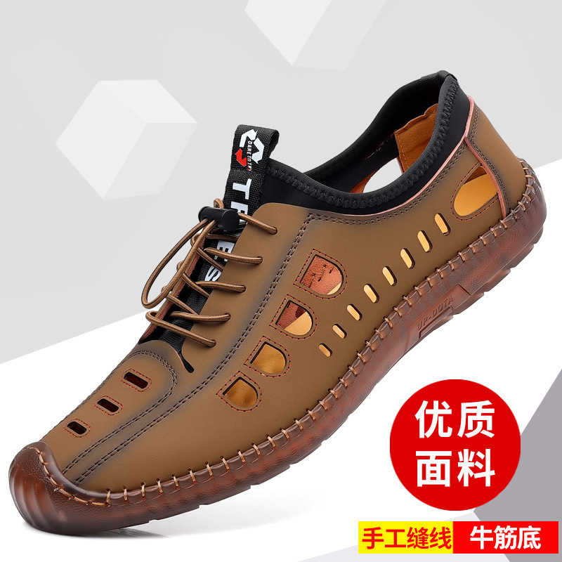 2024 Summer New Men's Mesh Hiking Shoes with Leather Soft Sole Casual Breathable Soft Leather Hand Stitched Hole Shoes