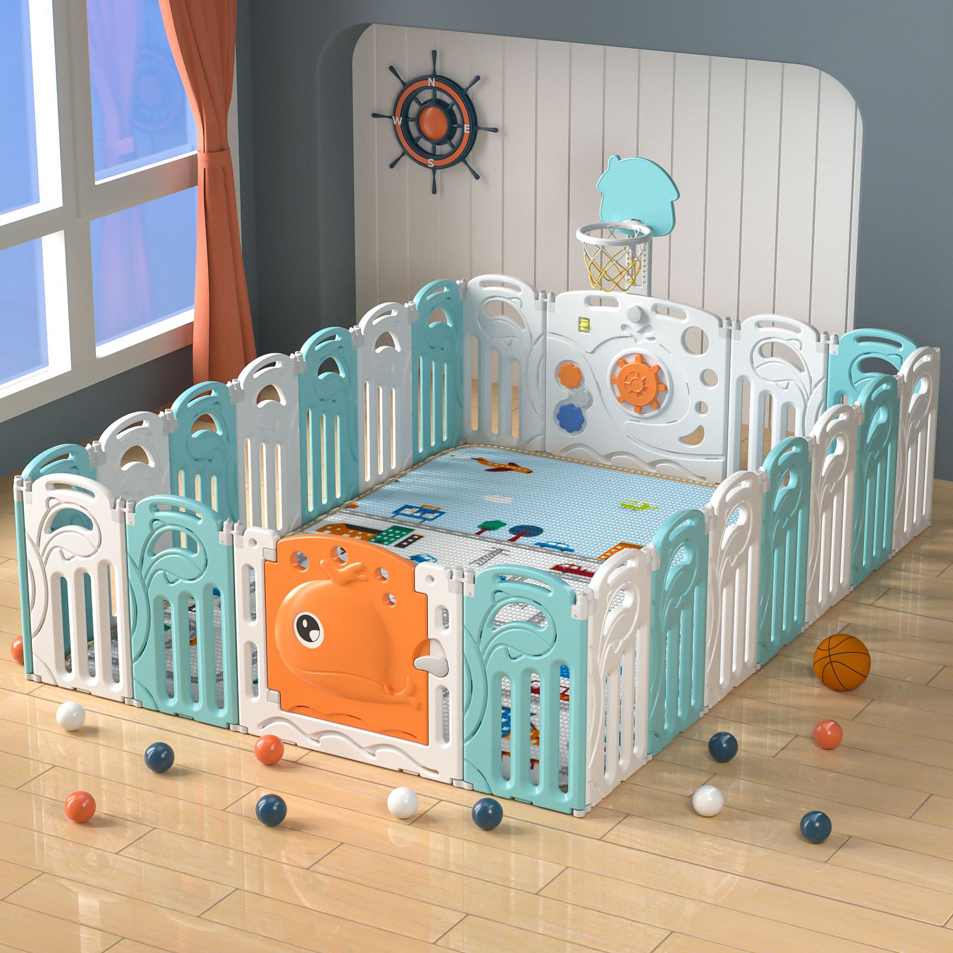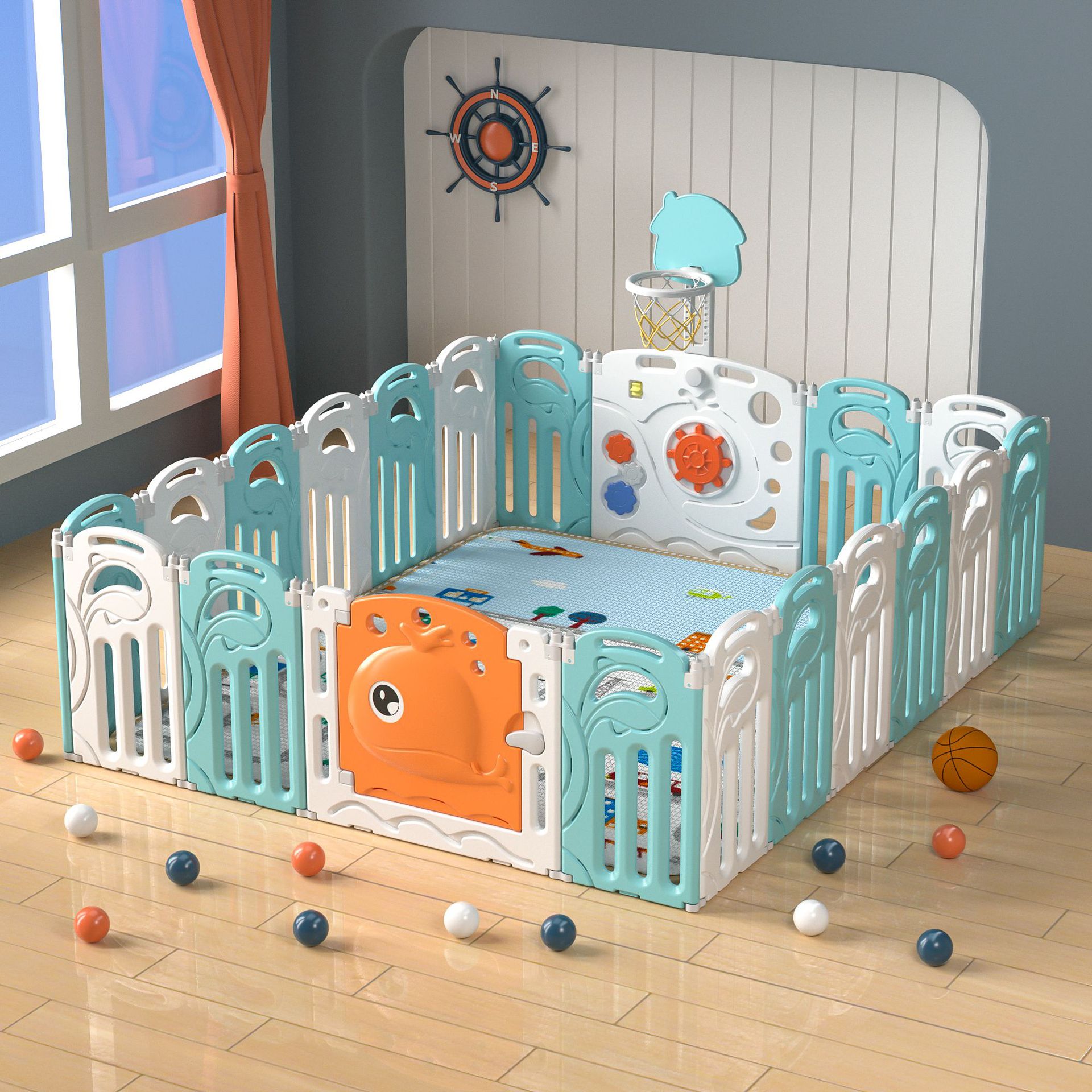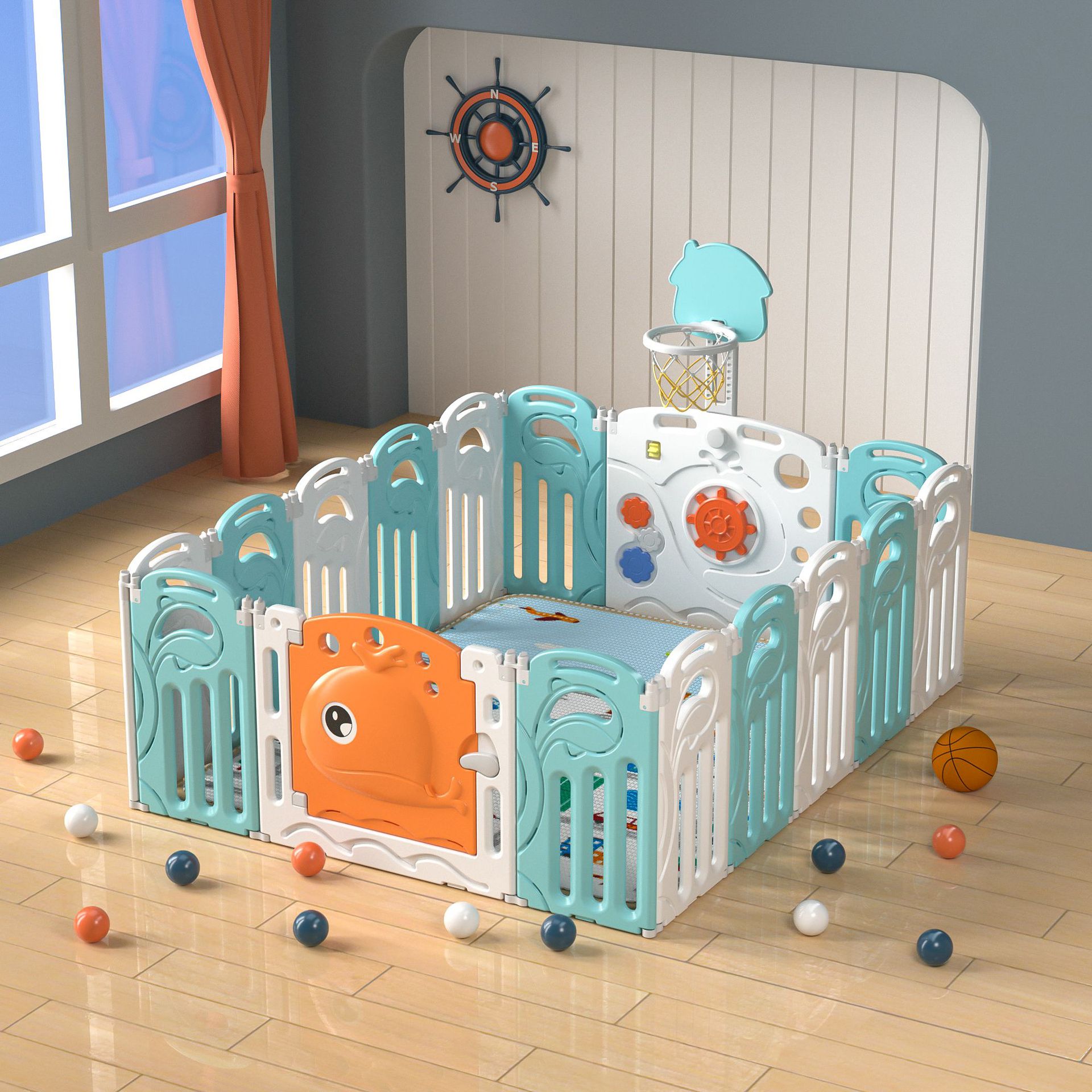 Whale fence green and white 16+2+with basketball rack