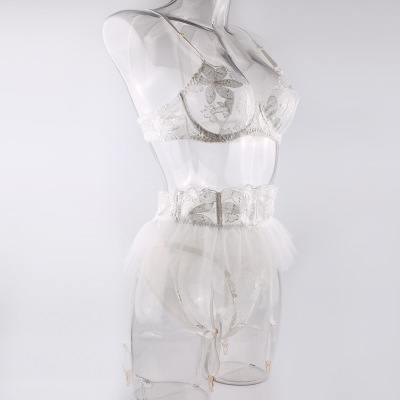新款歐美ins網紅風紗裙荷葉邊吊襪帶緊身情趣內衣三件套刺繡鋼圈