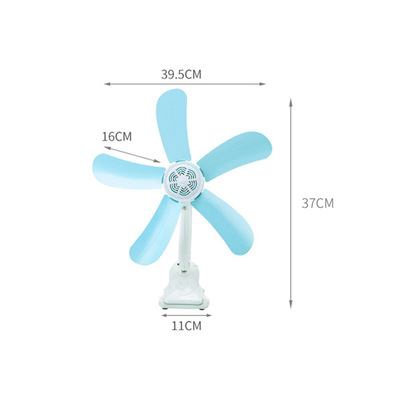 Manufacturer of small, portable electric fan with silent high wind power, designed for dormitory rooms featuring five-leaf hinged fans on a compact bed base.