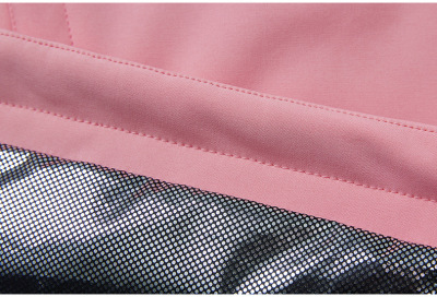 A pink-gray-white top + reflective pink pants