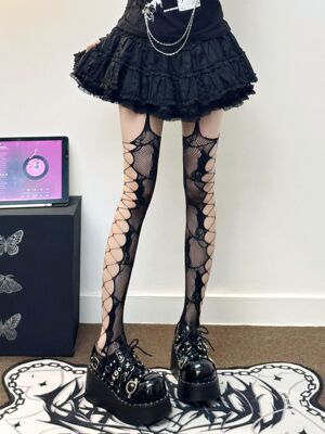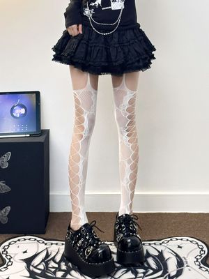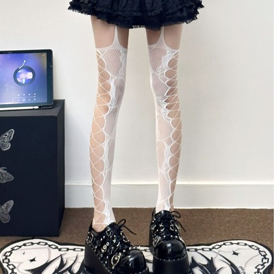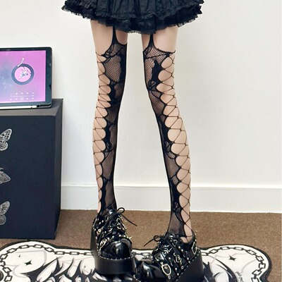 Rose-patterned side-crossing hollow-out suspender one-piece mesh stockings—sassy, long-length JK-style over-the-knee ultra-thin slimming subculture style.