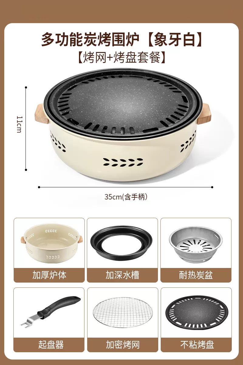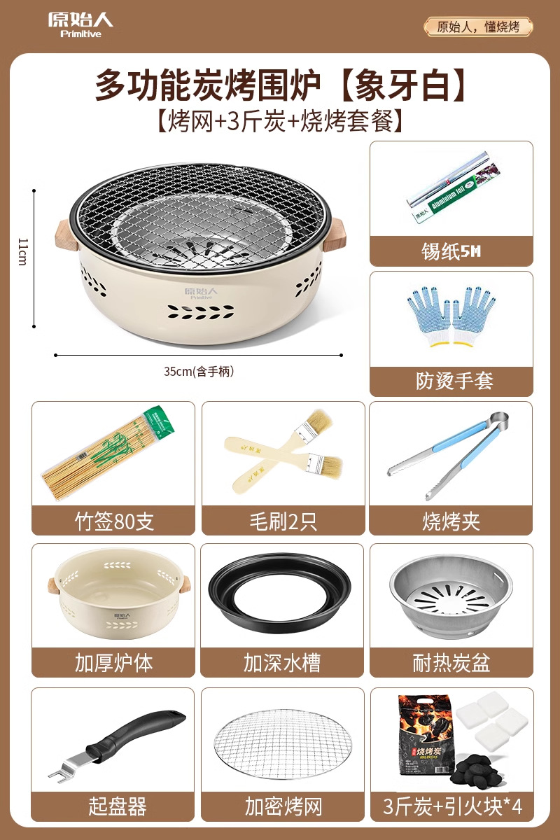 Grill/Plate specifications: Primitive label campfire white + grill net + grill plate + 3 lbs charcoal + fire starters * 4 + five-piece set