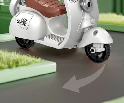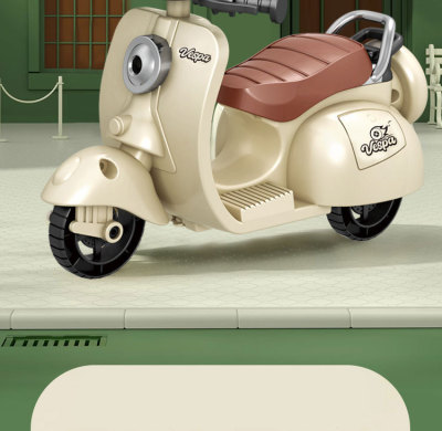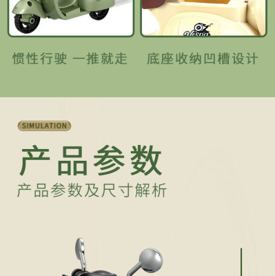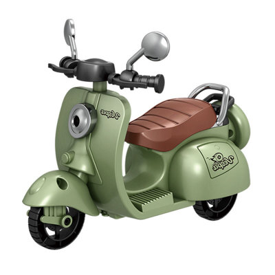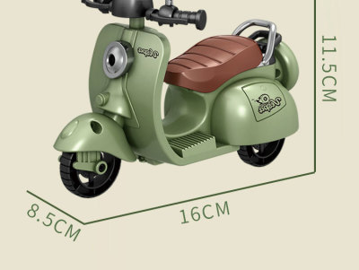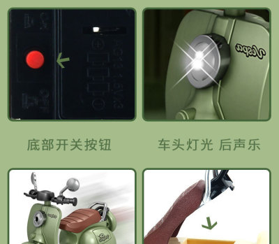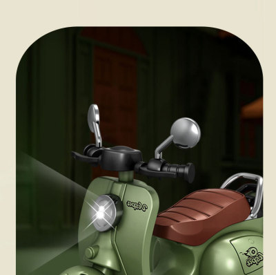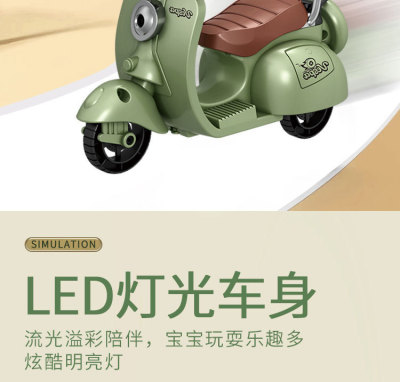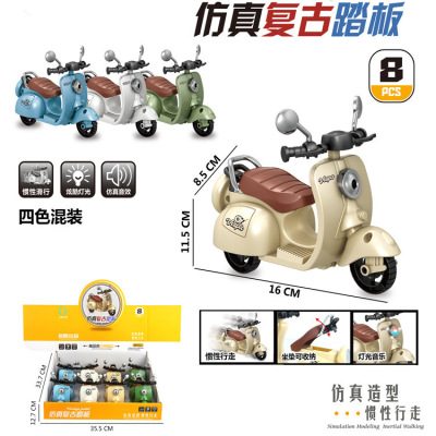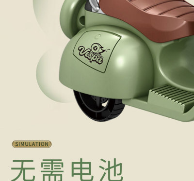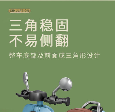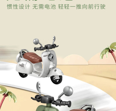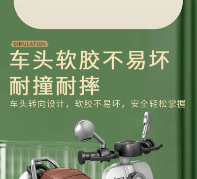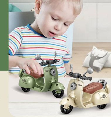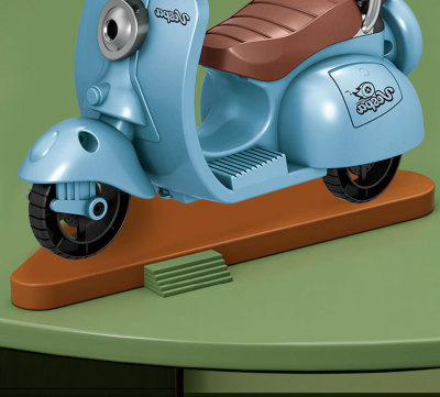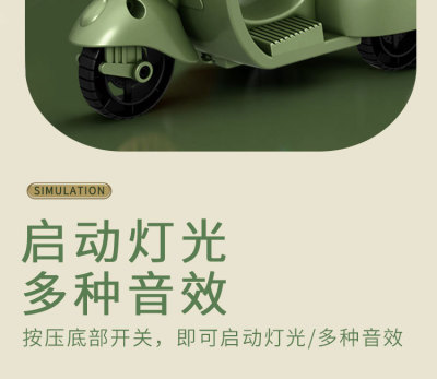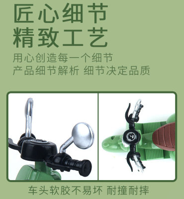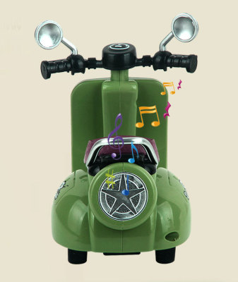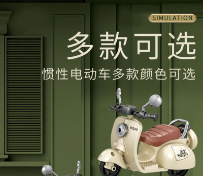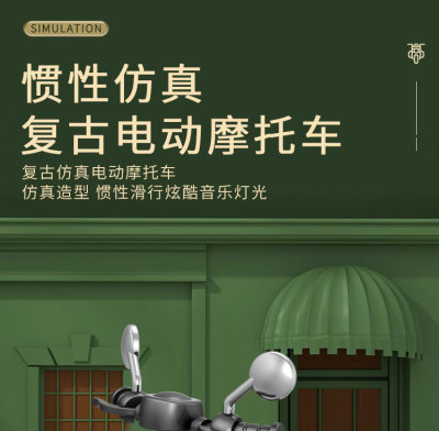 The girl performing tricks on a vintage-style three-wheeled electric motorcycle toy with a music boy.