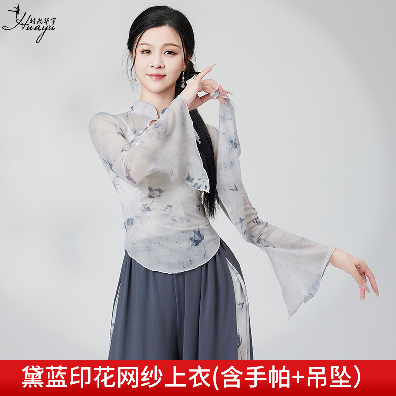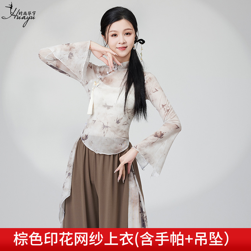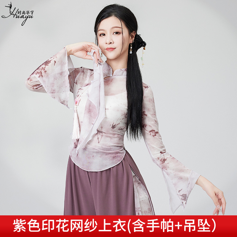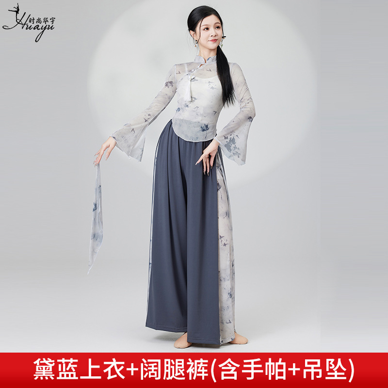 Classical dance costume for Chinese dance girls, flowing printed chiffon robe with loose wide-leg dance pants, modern dance performance set
