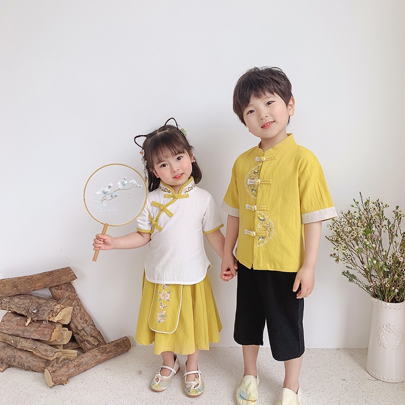 Children's Performance Outfits, Class Uniforms, Hanfu, Chinese-style Kindergarten Wear, Mid-Autumn Festival Short-Sleeve Sets for Boys and Girls, and Tang Dynasty-inspired Performance Attire