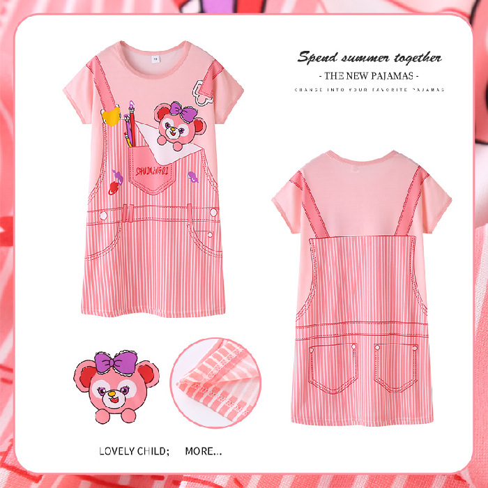 Overseas foreign trade summer children's pajamas for girls, thin milk silk, sweet and cute cartoon hooded short-sleeved nightgowns, stylish