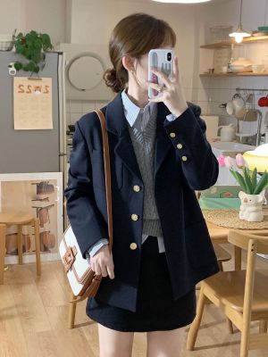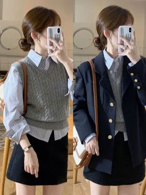 Early autumn clothing is paired with a new set of college-style travel wear, a vest, shirt and skirt three-piece suit